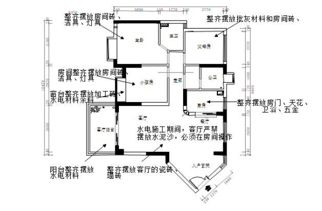 1、廚房、衛(wèi)生間大面積墻面磚鋪貼完,清理磚面,用公司統(tǒng)一水電標(biāo)示貼標(biāo)示水管線管走向。