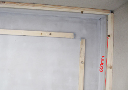 1、試水前用1:3水泥砂漿在門口如圖做門坎,防水待干透后,沉池放滿水浸泡48小時(shí),檢查樓下及周圍墻面是否有滲漏情況,經(jīng)甲方和物業(yè)簽字后,方可進(jìn)行下一工序。
