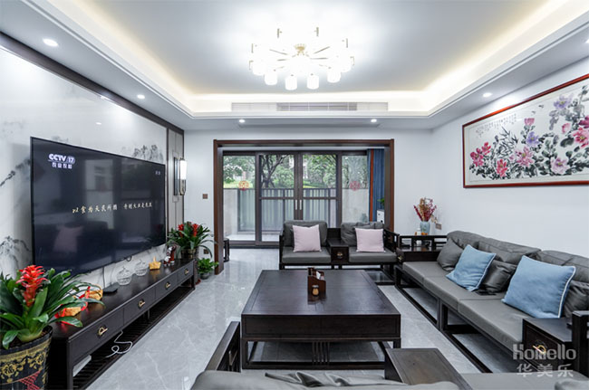 3、客廳的打造的水墨風(fēng)讓人一眼就能感受到新中式與現(xiàn)代風(fēng)結(jié)合出來(lái)的雅致與貴氣,擁有美感的同時(shí)不失實(shí)用性。