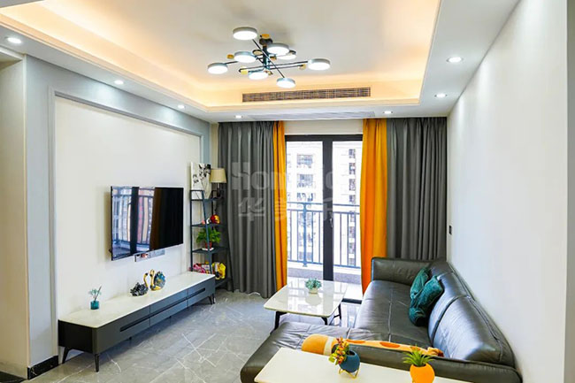 客廳是以灰白經典配色為主的簡約空間,天花做了邊頂設計,打造了中央空調來優(yōu)化的空間布局與提升生活體驗。電視背景墻的主體沿用了原始結構乳膠漆墻,邊沿加上了淺灰色包邊設計來塑造一點層次感。