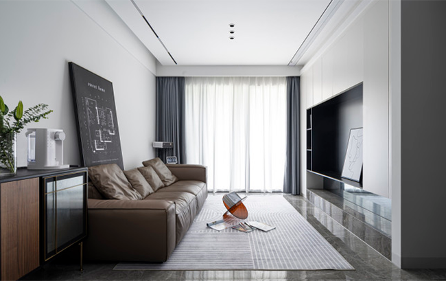 客廳采取無主燈設計,吊頂做磁吸燈,黑色極窄軌道簡潔,增加空間流動感。同時在吊頂中暗藏燈帶作為間接照明。